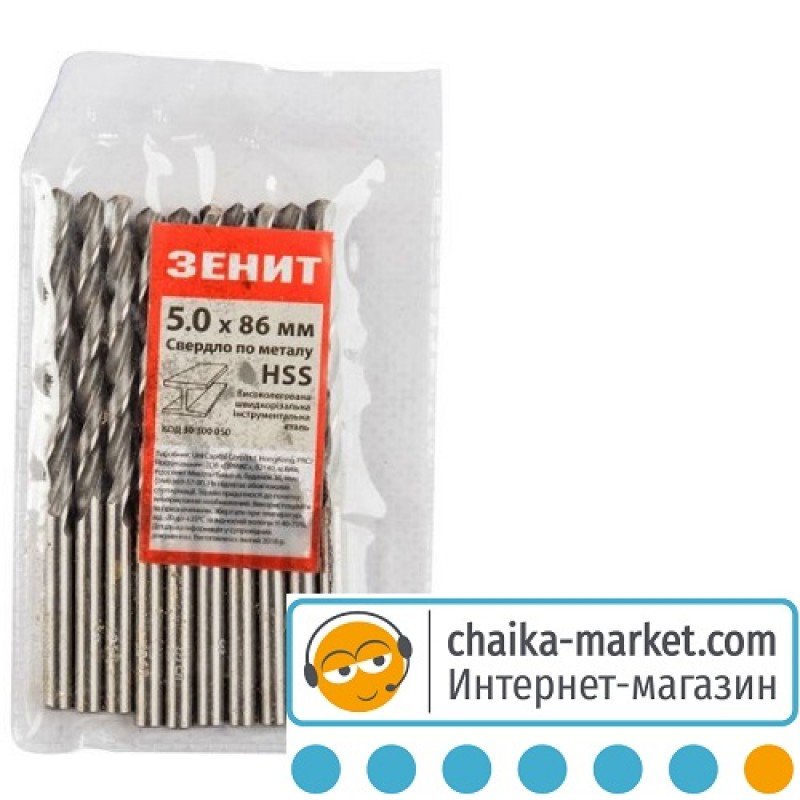 Свёрла HSS Зенит изготовлены из быстрорежущей легированной стали, основу сплава которой составляют вольфрам, молибден, ванадий и хром. Имеют твёрдость режущей части 62-64 HRC. Стандартные размеры соответствуют DIN 338, HSS-G.