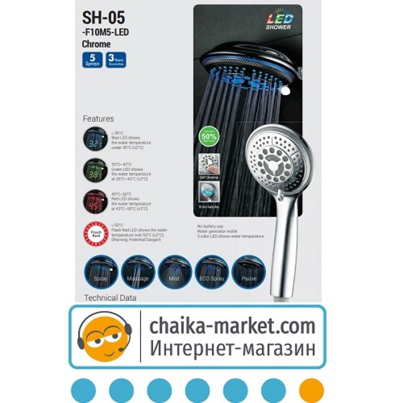 лійки для душу STORM SH-05 показує температуру води під 43 - 50 °C (+/- 2 °C)